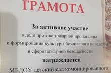 Наш детский сад был награжден грамотой за активное участие в деле противопожарной пропаганды и формирования культуры безопасного поведения в сфере пожарной безопасности.