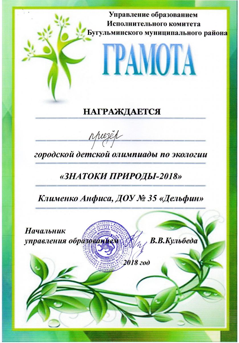 Опубликовано: 18.01.2018Наша воспитанница Клименко Анфиса стала призёром городской детской олимпиады по экологии "Знатоки природы - 2018".