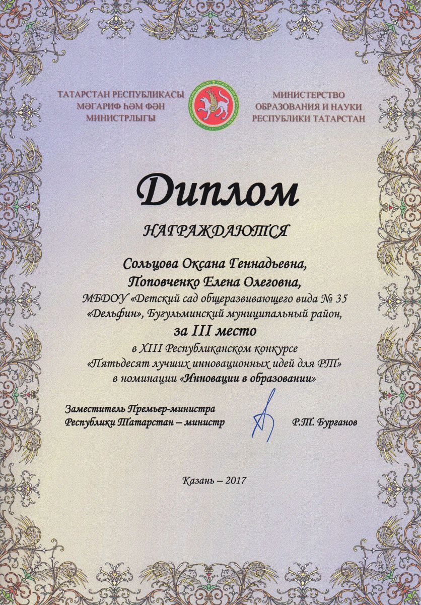 Опубликовано: 08.02.2018Наши педагоги - Сольцова Оксана Геннадьевна и Поповченко Елена Олеговна заняли III место в XIII Республиканском конкурсе "Пятьдесят лучших инновационных идей для РТ" в номинации "Инновации в образовании".