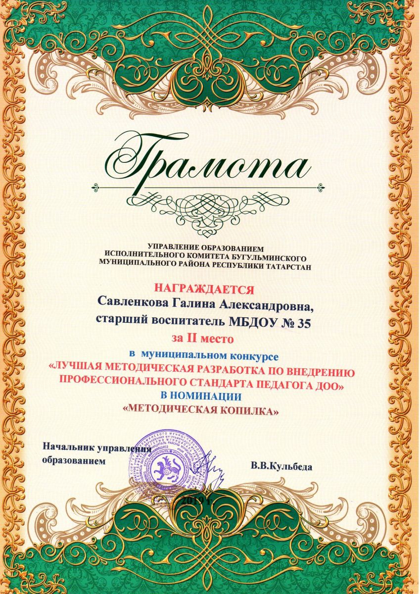 Опубликовано: 20.05.2019Старший воспитатель - Савленкова Галина Александровна, приняла участие в муниципальном конкурсе "Лучшая методическая разработка по внедрению профессионального стандарта педагога ДОО" и заняла 2 место в номинации "Методическая копилка".