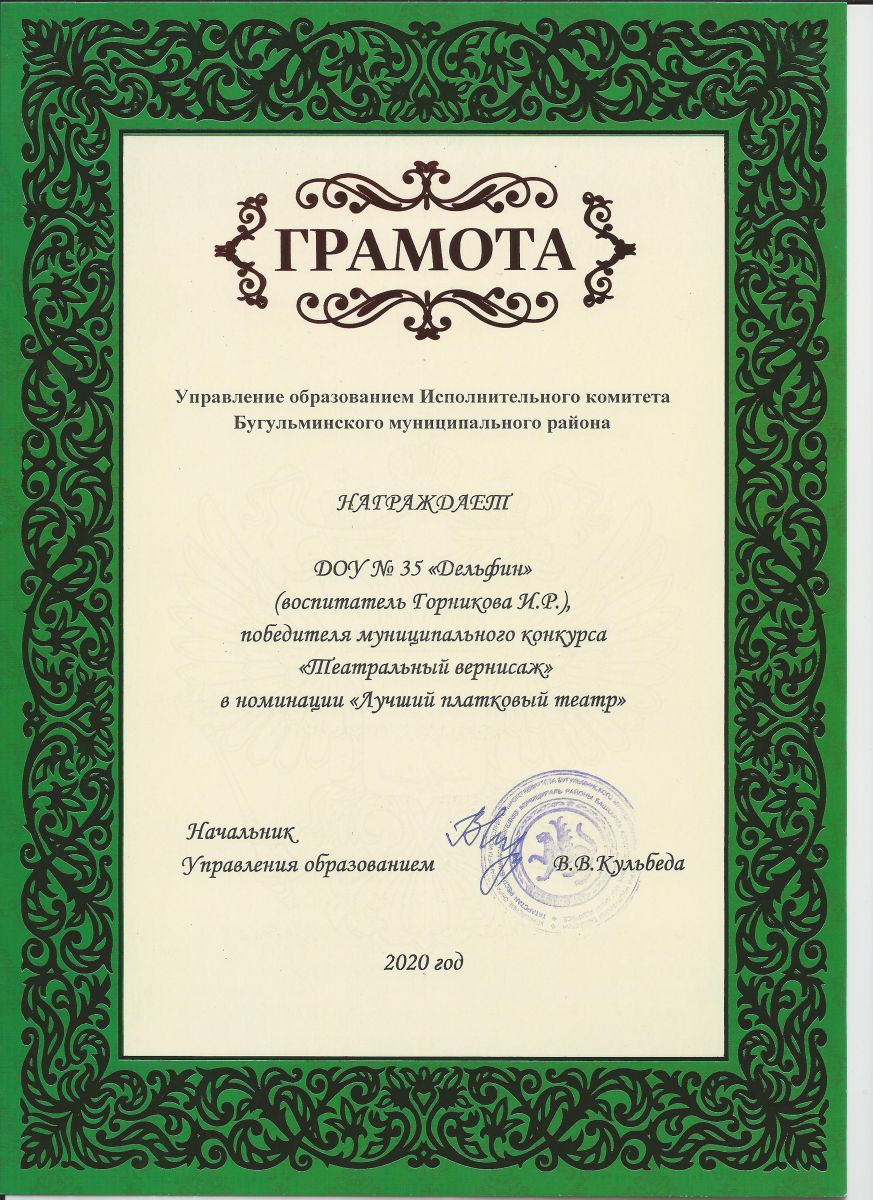 Муниципальное бюджетное дошкольное образовательное учреждение детский сад общеразвивающего вида №35 «Дельфин» Бугульминского муниципального района Республики Татарстан/ Татарстан Республикасы Бөгелмә муниципаль берәмлеге мәктәпкәчә белем бирү муниципаль бюджет учреждениесенең балаларны һәрьяктан тәрбияләп үстерү буенча бер яисә берничә өстенлекле юнәлештәге 35нче “Дельфин” балалар бакчасы