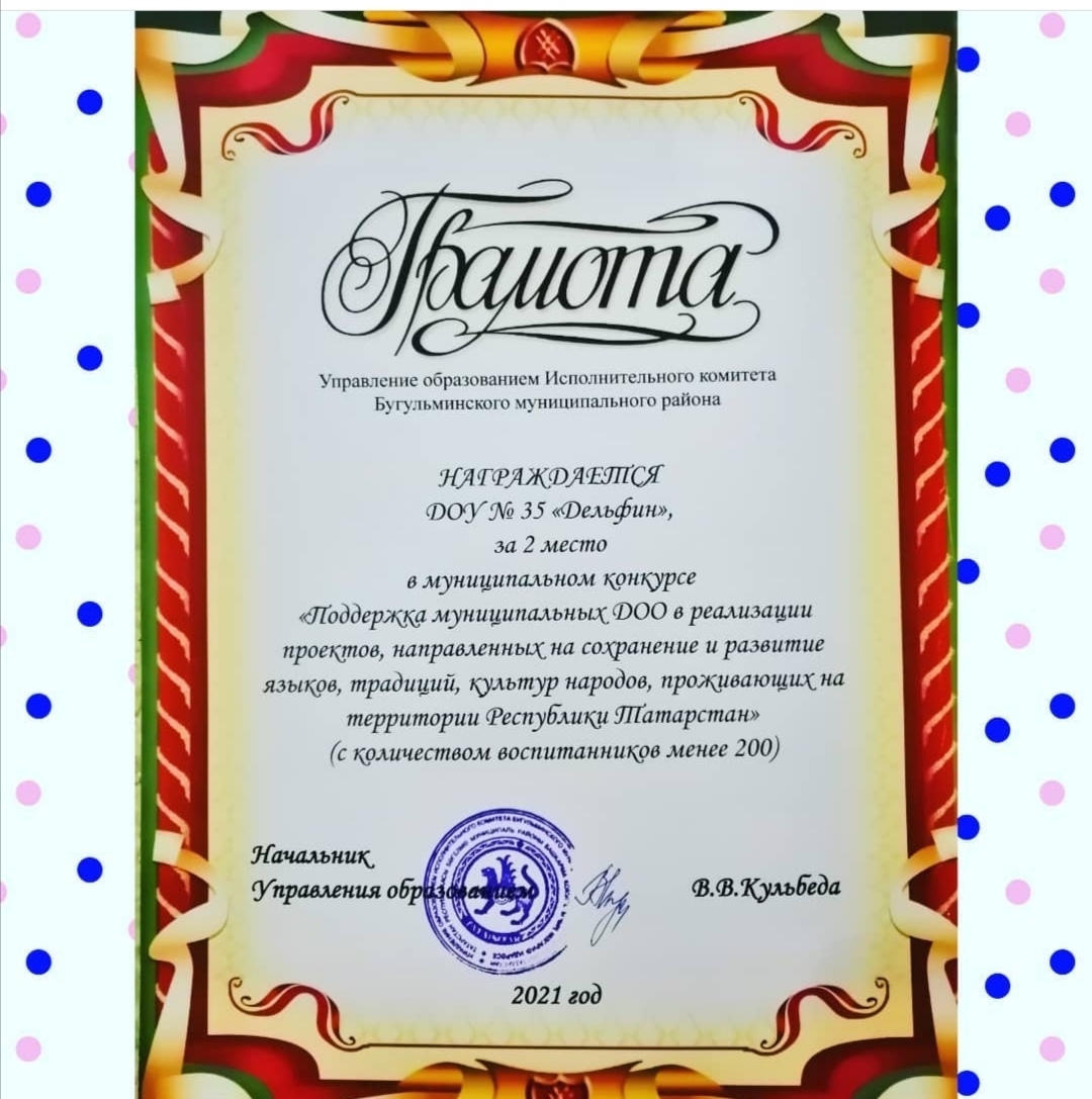 Опубликовано: 16.09.2021Ура!!! 2 место - Наш детский сад принял участие в муниципальном конкурсе «Поддержка муниципальных ДОО в реализации проектов, направленных на сохранение и развитие языков, традиций, культур народов, проживающих на территории Республики Татарстан»