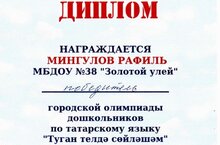 Поздравляем воспитанника подготовительной к школе татарской группы № 3 Мингулова Рафиля с победой в городской олимпиаде по татарскому языку. "Туган телдә сөйләшәм" Желаем дальнейших успехов и побед!
