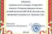 "Алтын күч" коллективы музыка җитәкчесе Чупахина Светлана Ивановнаны һәм татар телен укыту буенча тәрбияче Ситдыйкова Эльвира Атлас кызын "Татар халык әкиятләре" бүлегендә "Сайяр - 2023" муниципаль конкурсында җиңү белән котлыйбыз. Иҗади илһам һәм яңа һөнәри казанышлар телибез!
