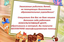 Если Ваш ребенок не посещает детский сад и у Вас возникают вопросы, связанные с воспитанием и развитием ребенка, то Вы можете обратиться в наш центр и получить совершенно БЕСПЛАТНО консультационную и педагогическую помощь воспитателей и приглашенных специалистов. Мы ответим на Ваши вопросы, поможем Вам обогатить свой педагогический опыт, посоветуем необходимую педагогическую литературу. Подскажем Вам , как создать у себя дома полноценную развивающую среду для ребенка. Консультационную помощь родителям (законным представителям) окажут заведующий, старший воспитатель, логопед, педагог-психолог, музыкальный руководитель, старшая медицинская сестра детского сада.\ Безнең балалар бакчасында йөрүче ата-аналарга (законлы вәкилләргә), мәктәпкәчә яшьтәге балаларга консультация үзәге эшли. Әгәр балагыз балалар бакчасына йөрми икән, балагызны тәрбияләү һәм үстерү белән бәйле сораулар туа икән, сез безнең үзәккә мөрәҗәгать итә һәм тәрбиячеләргә, чакырылган белгечләргә бушлай консультация һәм педагогик ярдәм ала аласыз. Без сезнең сорауларга җавап бирәчәкбез, сезгә педагогик тәҗрибәгезне баетырга ярдәм итәчәкбез, кирәкле педагогик әдәбиятны киңәш итәбез. Үзегезгә өйдә бала өчен тулы канлы үсүче мохит булдыру турында сөйләячәкбез. Ата-аналарга (законлы вәкилләргә) консультация ярдәмен балалар бакчасының мөдире, өлкән тәрбияче, логопед, педагог-психолог, музыка җитәкчесе, өлкән шәфкать туташы күрсәтәчәк.