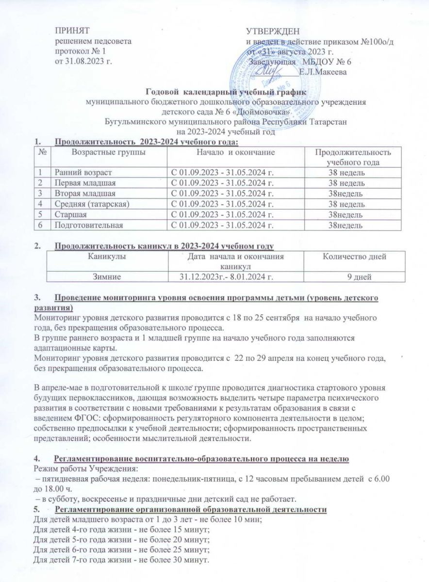 Годовой календарный учебный график МБДОУ № 6 "Дюймовочка" на 2023-2024 уч.год