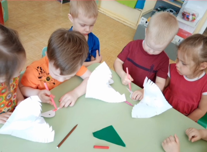 В нашей группе мы организовали творческую мастерскую по подготовке празднования Великой победы. Мы вырезали символы памяти о погибших солдатах — журавлей. Ребята очень старались! И решили подарить этих журавлей малышам из ясельной группы.