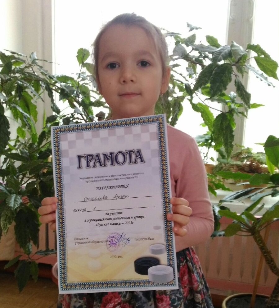 В детском саду № 31 "Алёнушка" прошёл городской шашечный турнир. В нём принимали участие дети из всех городских и сельских детских садов. Приняла участие в шашечном турнире и наша Останкова Арина.