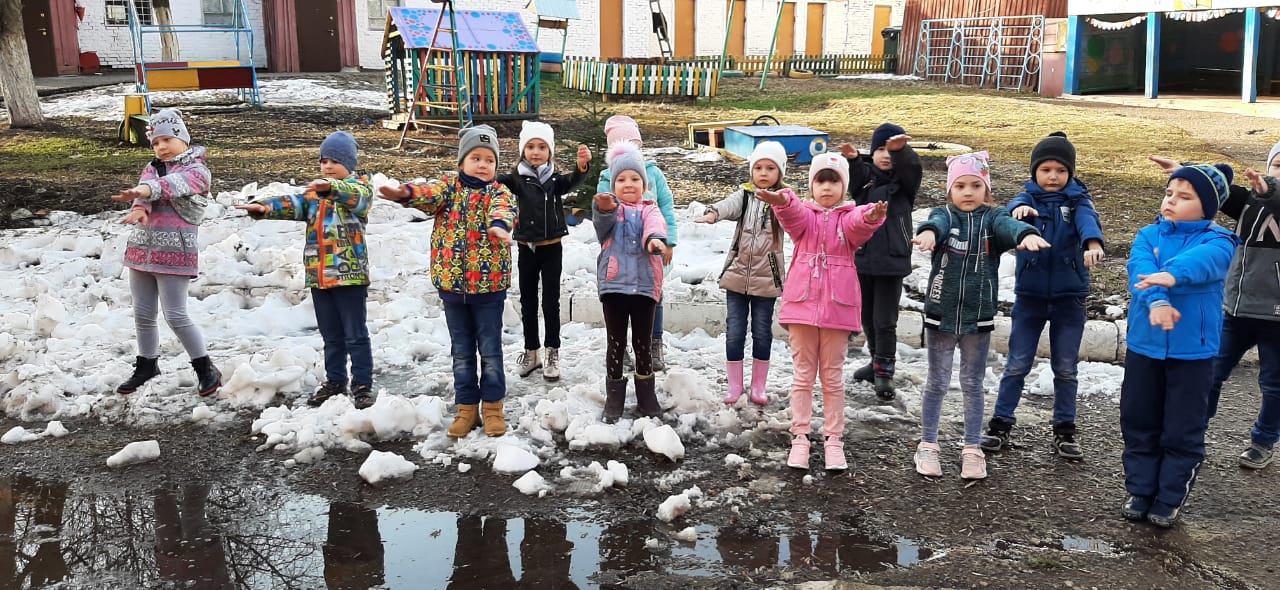 Взрослые и дети принимали участие в акции "Приближаем весну". Ежедневно взрослые ворошили снег, чтобы он быстрее растаял, и выглянула зелёная травка. А дети решили помочь сотрудникам детского сада, устроив на последних снеговых кучках зажигательный флешмоб.
