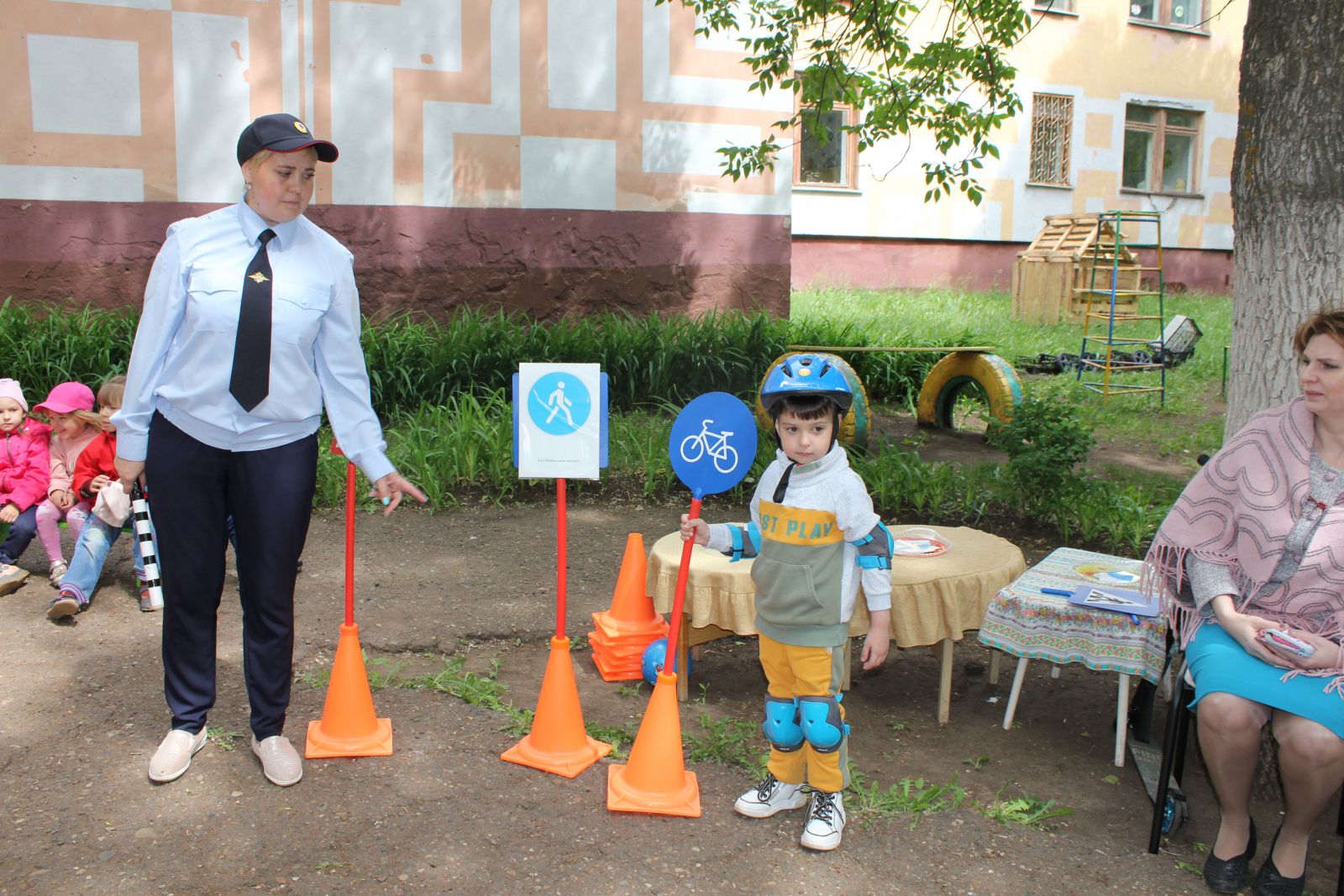 Дети «отправились» в путешествие со своим любимым самокатом или велосипедом, показывая умение управлять транспортным средством. В пути их встретил инспектор дорожного движения, который проверил у детей теоретические знания правил дорожного движения и познакомил с историей создания велосипеда, научил пользоваться специальными средствами защиты при езде на велосипеде и самокате.