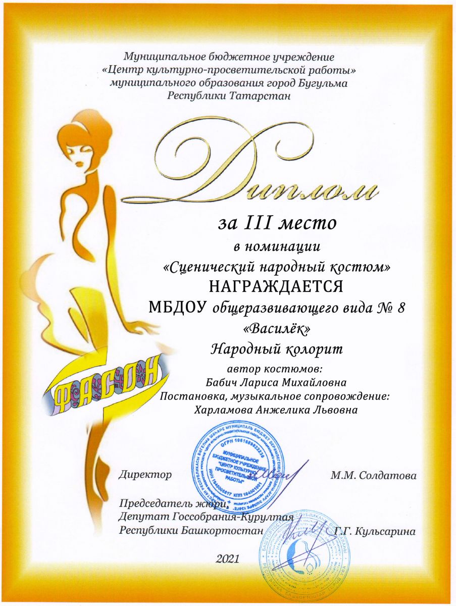 Опубликовано: 18.12.202118 декабря воспитанники нашего детского сада приняли участие в зональном Фестивале народной моды "Фасон", который проходил в МБУ МЦ "Дворец молодёжи". Фестиваль проводился при поддержке Исполнительного комитета Бугульминского муниципального района.