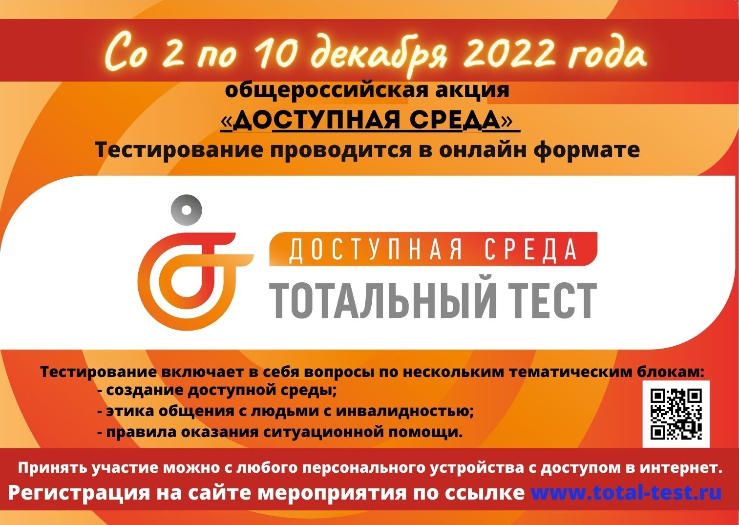 Со 2 по 10 декабря 2022 года каждый житель России сможет проверить свои знания по вопросам ситуационной помощи, этики общения и создания доступной среды для людей с инвалидностью. Общероссийская акция Тотальный тест «Доступная среда» приурочена к Международному дню инвалидов и направлена на привлечение внимания россиян к правам и потребностям людей с инвалидностью.