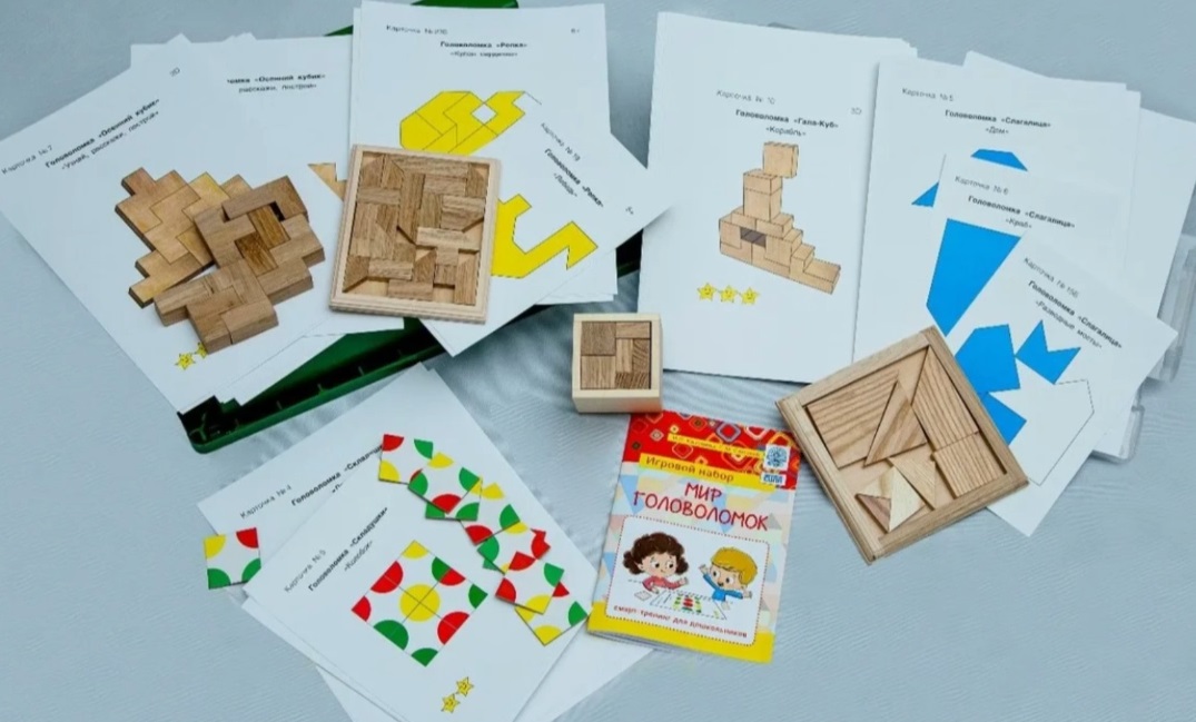 Игровой комплект "МИР ГОЛОВОЛОМОК" (авторы – И.И. Казунина, Е.Ю. Соловей) направлен на развитие творческих и умственных способностей ребёнка через игры-головоломки; помогает знакомить детей с разными видами головоломок, учит способам и правилам решения головоломок, используя алгоритм.