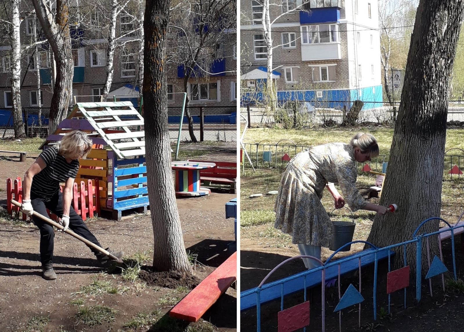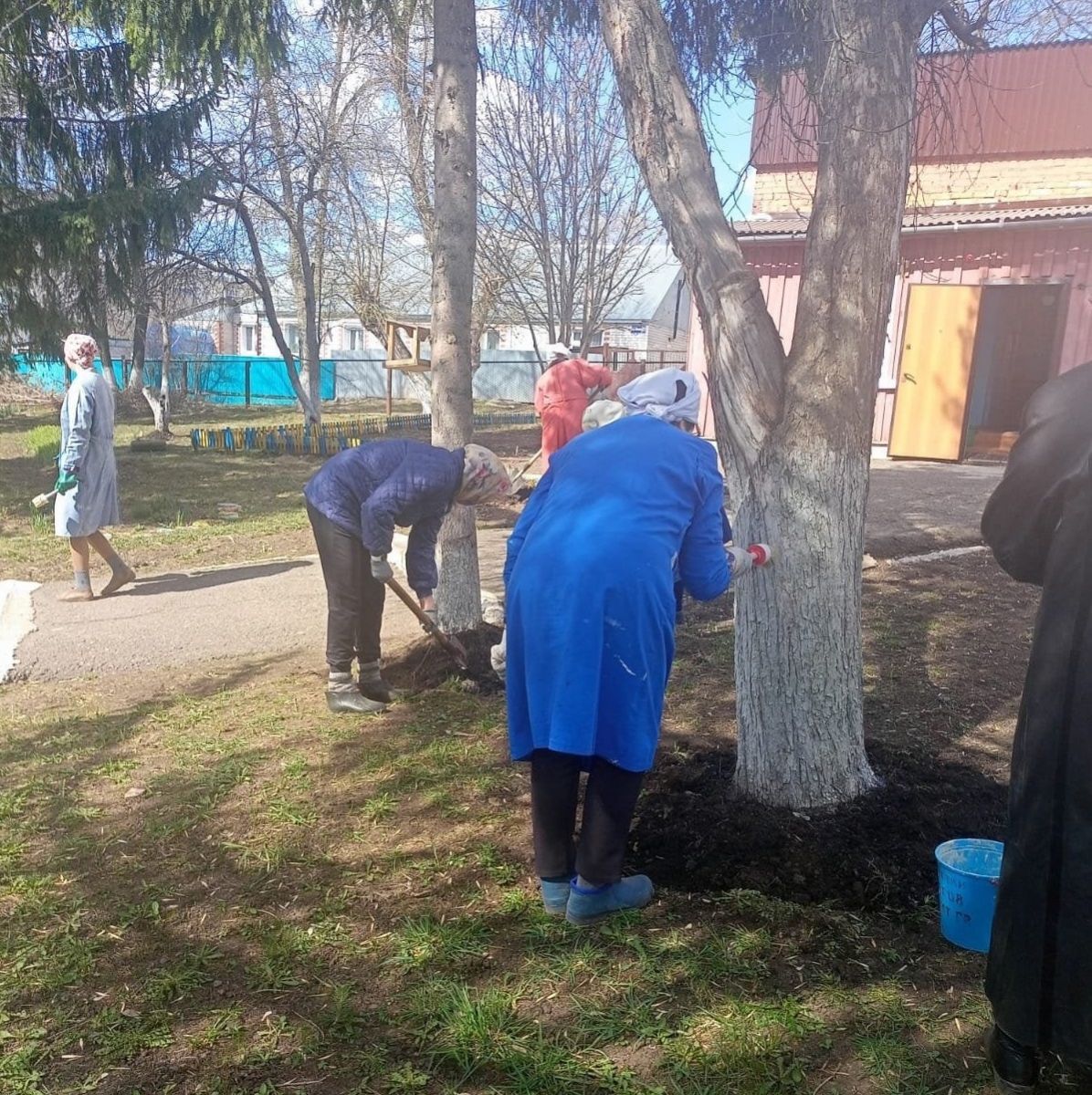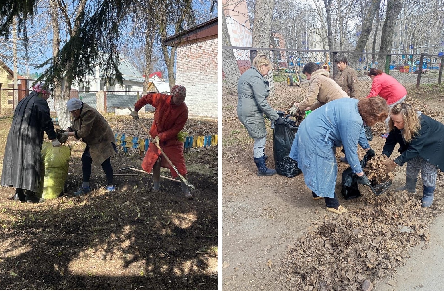 Вооружившись необходимым инвентарём, сотрудники детского сада дружно вышли на уборку территории. Все с удовольствием приводили в порядок территорию: подметали свои участки, собирали мусор; белили стволы деревьев, обкапывали их; сгребали листву и траву, приводили в порядок клумбы. Общими усилиями за несколько часов территория детского сада преобразилась: везде стало ещё чище и красивее.