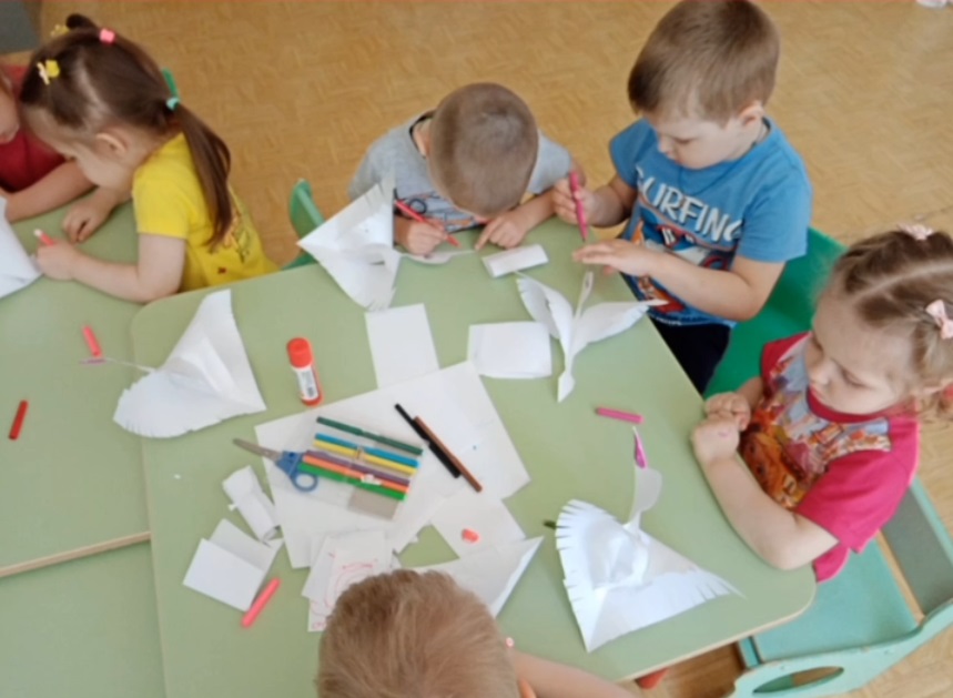 В нашей группе мы организовали творческую мастерскую по подготовке празднования Великой победы. Мы вырезали символы памяти о погибших солдатах — журавлей. Ребята очень старались! И решили подарить этих журавлей малышам из ясельной группы. (Смотреть видео!)