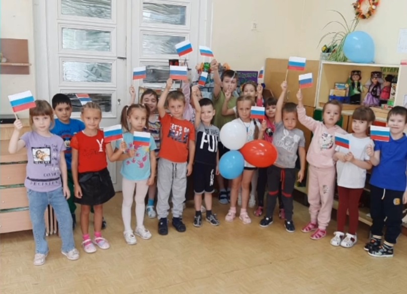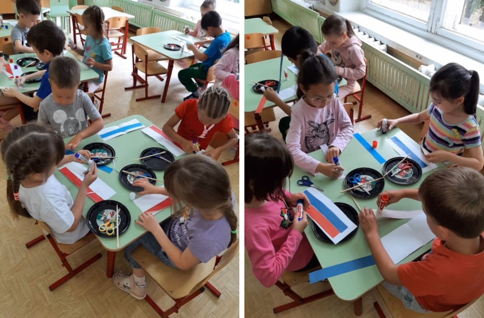 Накануне была проведена предварительная работа, где воспитатели познакомили детей с государственными символами России, беседовали о стране, читали стихи, пословицы и поговорки о нашей Родине, изготавливали флажки.