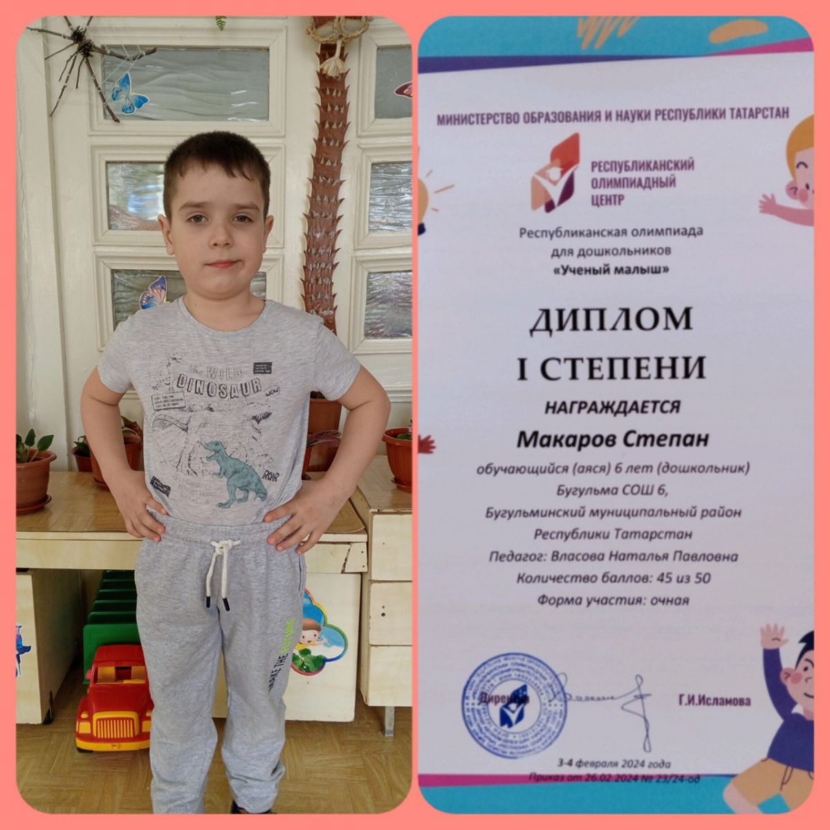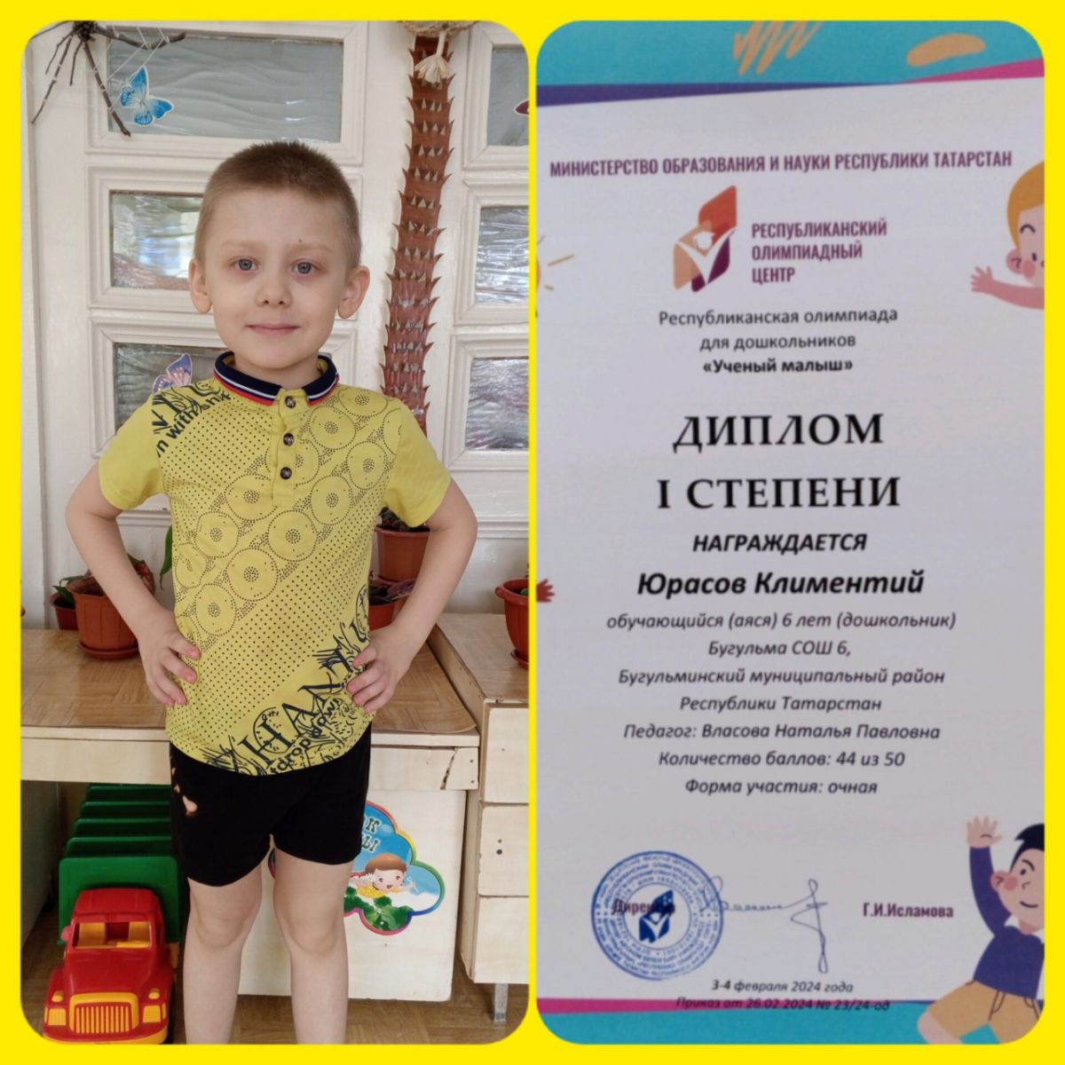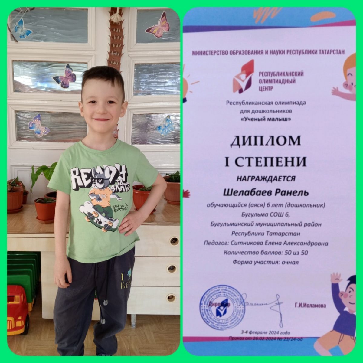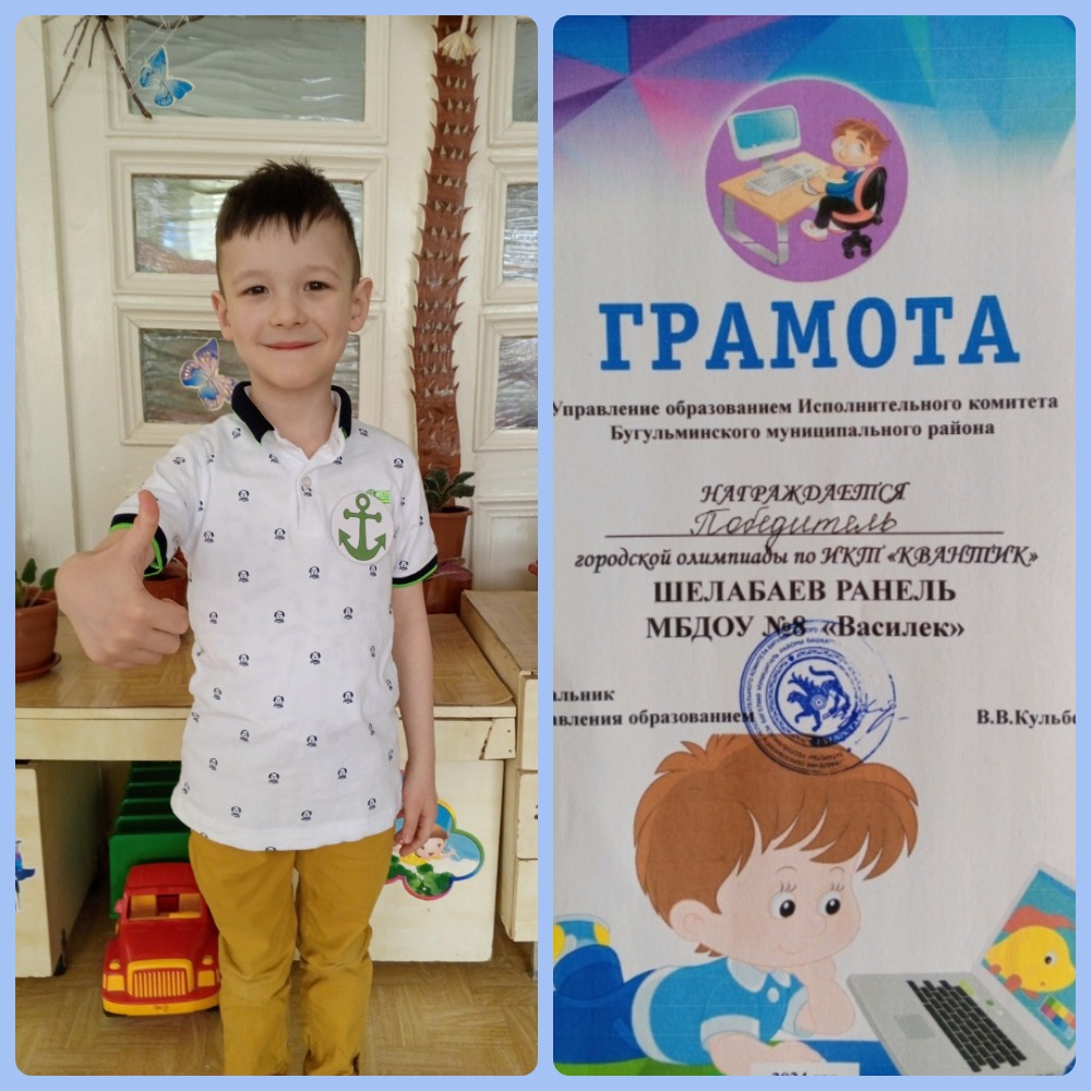 Наш Шелабаев Ранель (группа "Весёлые Ребята") принял участие в олимпиаде для дошкольников и стал победителем!!! Поздравляем с победой в олимпиаде! Только смелый, уверенный, знающий человек мог победить. Молодец! Желаем с таким же упорством и энтузиазмом продолжать поглощать знания. Желаем успехов, саморазвития, интересных открытий и важных событий в жизни!