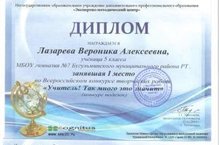 Ученица 5 класса Б Лазарева В. заняла I место во Всероссийском конкурсе творческих работ «Учитель! Так много это значит!» Также оргкомитет конкурса выразил благодарность классному руководителю Талиповой Г.И. за подготовку ученицы к участию в конкурсе. Поздравляем Веронику и желаем ей новых достижений и побед!