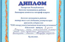Мәктәбебезнең татар теле һәм әдәбияты укытучысы Янгирова Ләйсән Фирдәвес кызы Бөгелмә муниципаль районы татар теле һәм әдәбияты укытучылары арасында уздырылган “XXI гасыр укытучысының педагогик остаханәсе” бәйгесендә III урынны яулады һәм дипломга лаек булды. Ләйсән Фирдәвесовна! Котлыйбыз һәм яңадан- яңа уңышлар телибез!