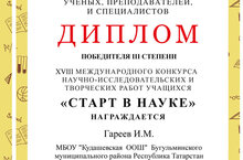 Ученик 8 класса Гареев Ильсур стал победителем Международного конкурса научно-исследовательских и творческих работ учащихся "Старт в науке". Награжден дипломом III степени. Центр естественно-научной направленности "Точка роста" даёт свои плоды.