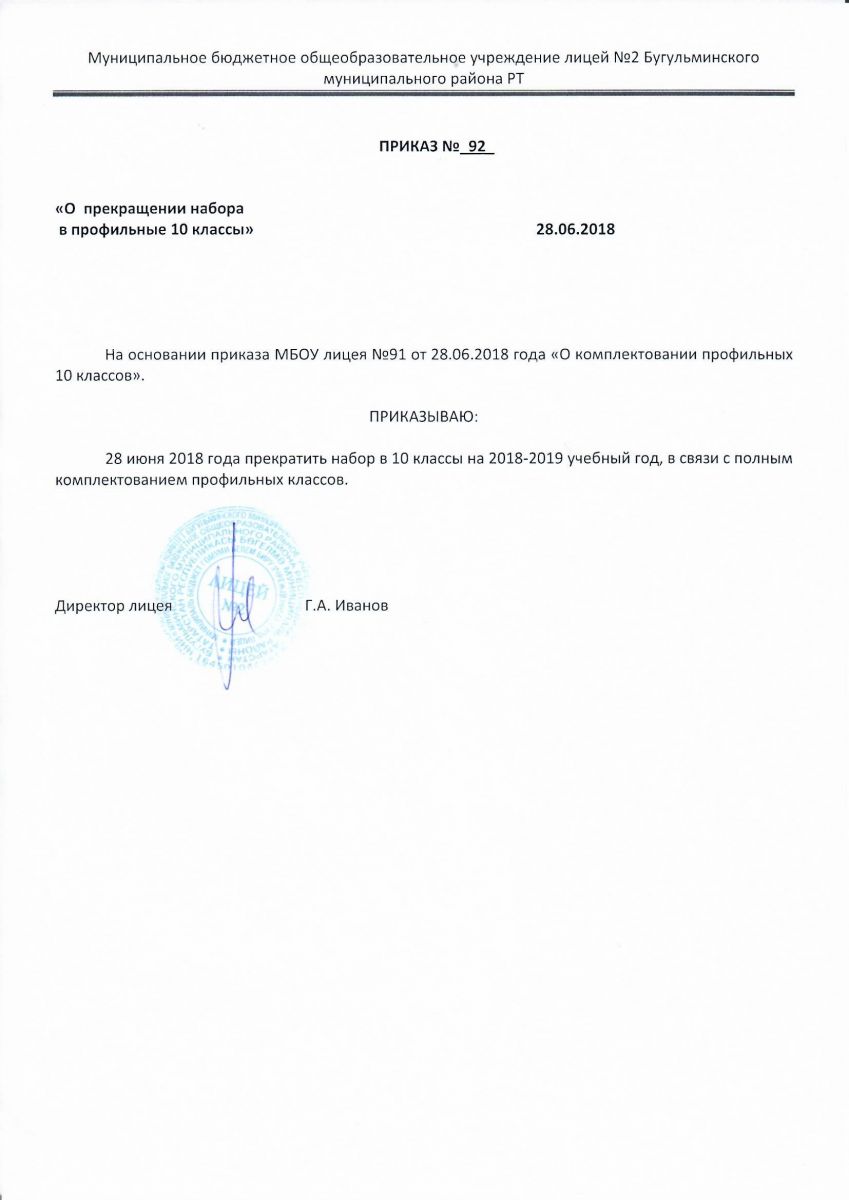 Приказ об окончании приёма в 10 класс на 2018-2019 учебный год
