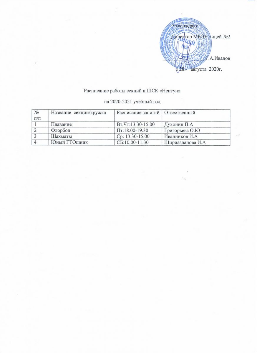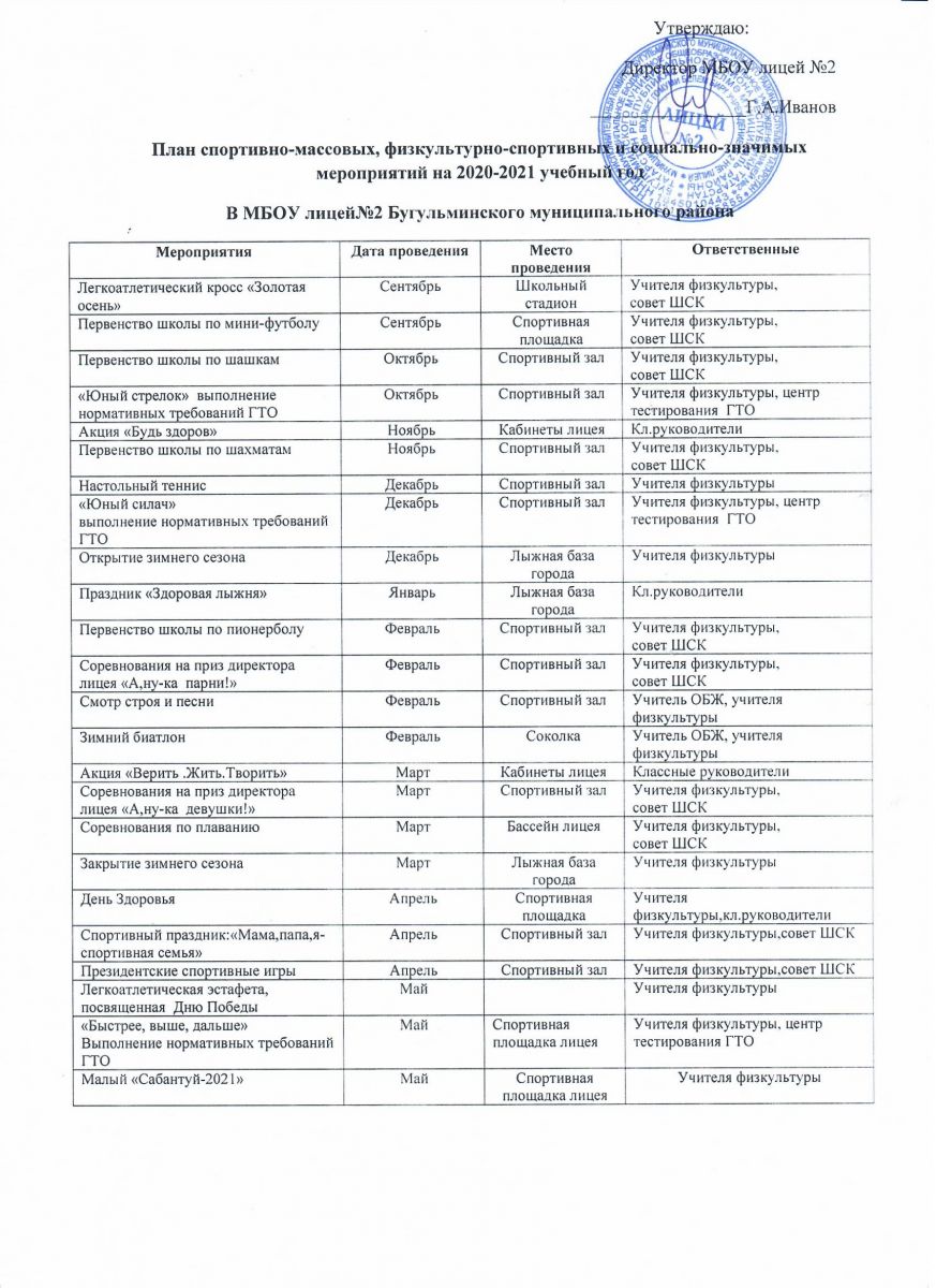 Календарный план спортивно-массовых мероприятий в лицее на 2020-2021 учебный год
