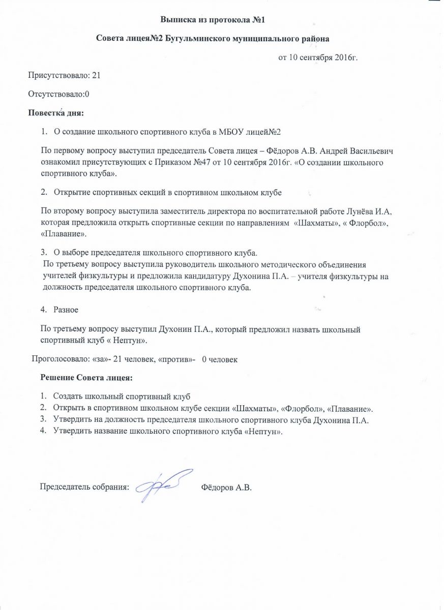 Протокол Совета лицея (о создании школьного спортивного клуба)