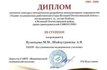 Методическая разработка «Сестра, ты помнишь, как из боя, меня ты вынесла в санбат?» (авторы – Кузнецова М.М., Шайхутдинова А.Я.) заняла 3 место.