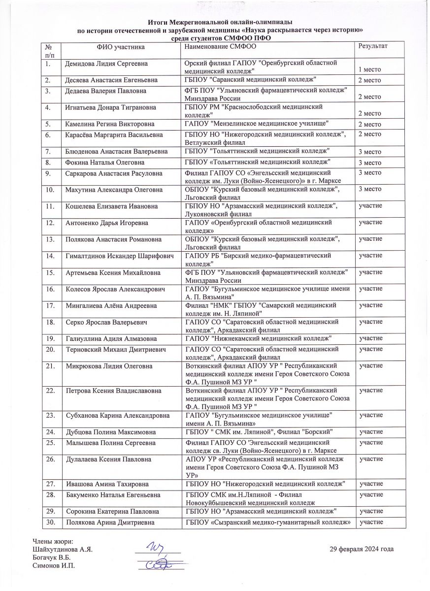Итоги межрегиональной онлайн-олимпиады «Наука раскрывается через ее историю» (по истории отечественной и зарубежной медицины) среди студентов средних медицинских и фармацевтических образовательных организаций Приволжского федерального округа