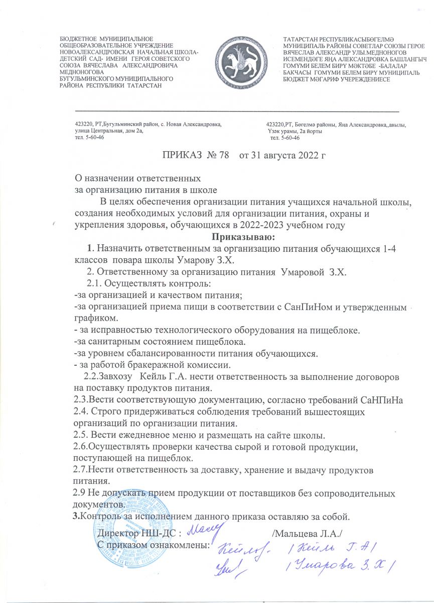 Приказ о назначении по питанию