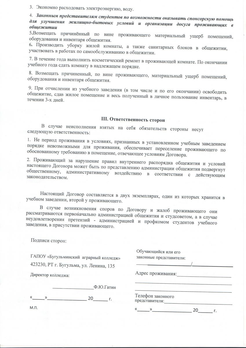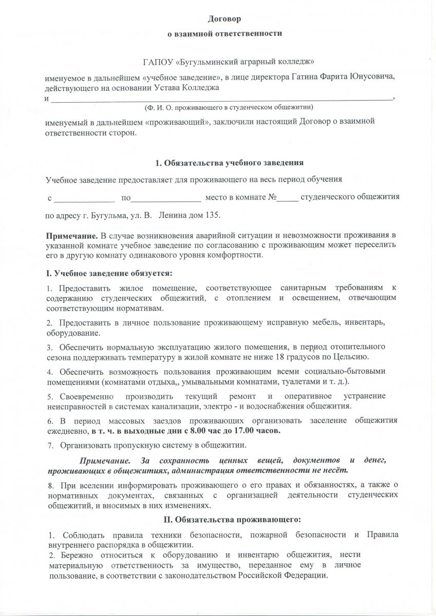 Договор на заселение в общежитие