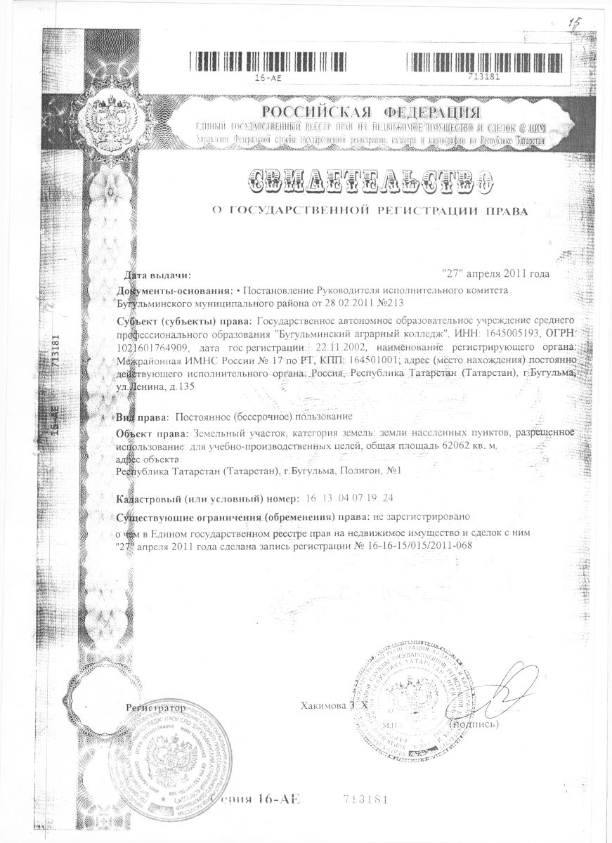 Адрес: 423230, Республика Татарстан, город Бугульма, ул. Владимира Ленина, дом 135