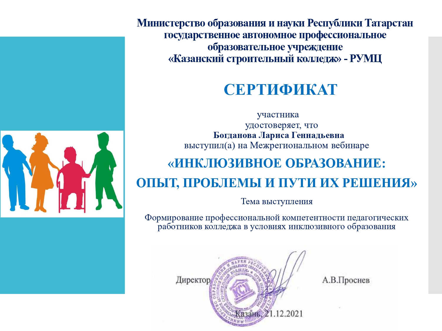 В настоящее время в системе среднего профессионального образования большое внимание уделяется изучению вопросов, связанных с обучением и социализацией обучающихся с ограниченными возможностями здоровья. В связи с этим, 21 декабря 2021 года состоялся Межрегиональный вебинар «Инклюзивное образование: опыт, проблемы и пути их решения». В мероприятии приняли участие 82 педагогических работника из профессиональных образовательных организаций Республики Татарстан, а также Оренбургской и Иркутской областей.