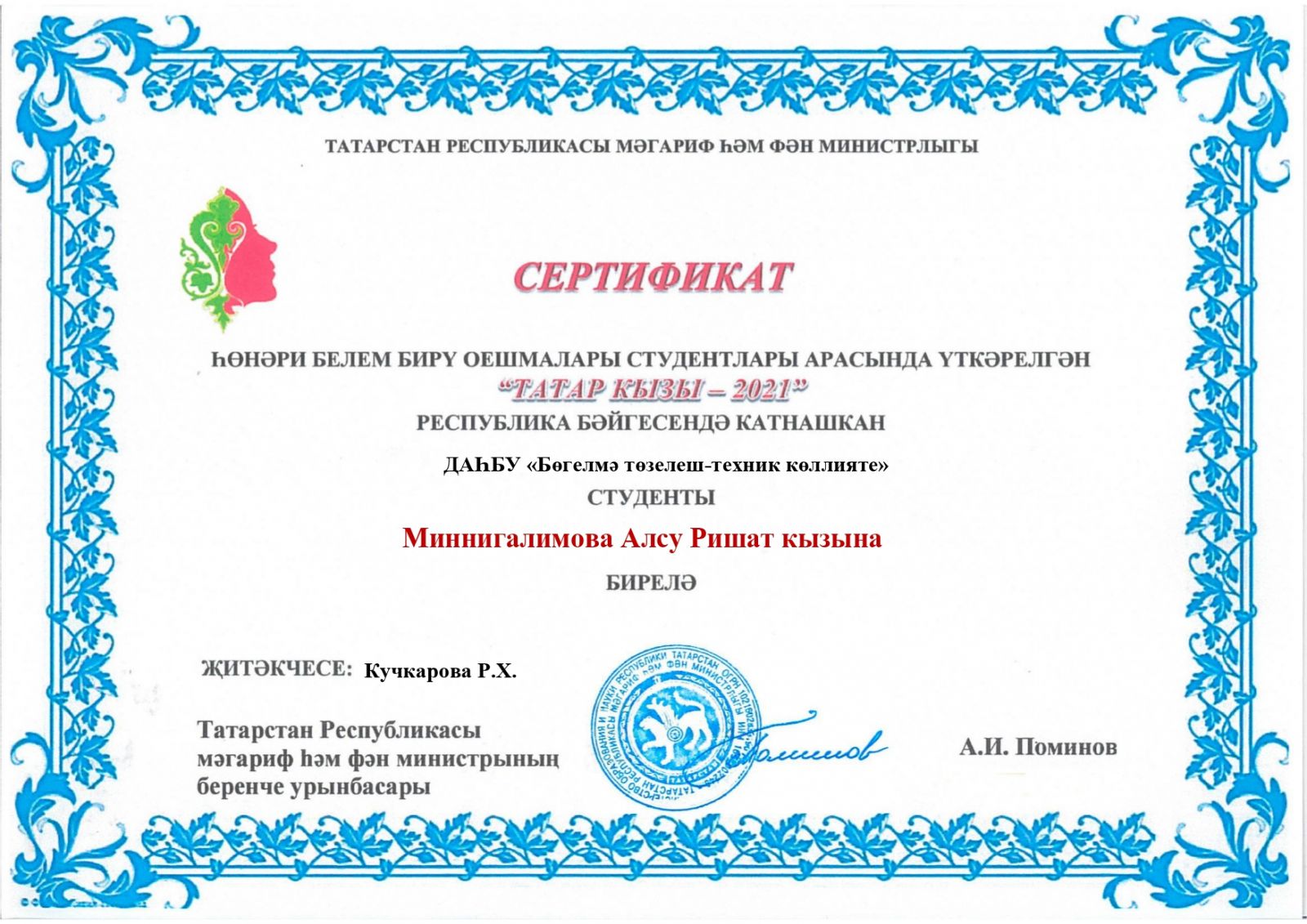 Конкурс проводился с целью раскрытия богатства внутреннего мира и лучших качеств татарской девушки, распространения и повышения интереса к языку, культуре, самобытности татарской нации. В заочном этапе дебютировала первокурсница Миннигалимова Алсу. Под руководством преподавателя Кучкаровой Регины Хамитовны участница подготовила видеоролик о семейных реликвиях и традициях. По итогам конкурса Алсу награждена Сертификатом.
