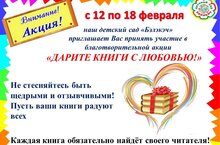С 12 по 18 февраля 2024 г в нашем детском саду прошла общероссийская акция «Дарите книги с любовью!», приуроченная к Международному дню книгодарения, который отмечается 14 февраля во многих странах мира.