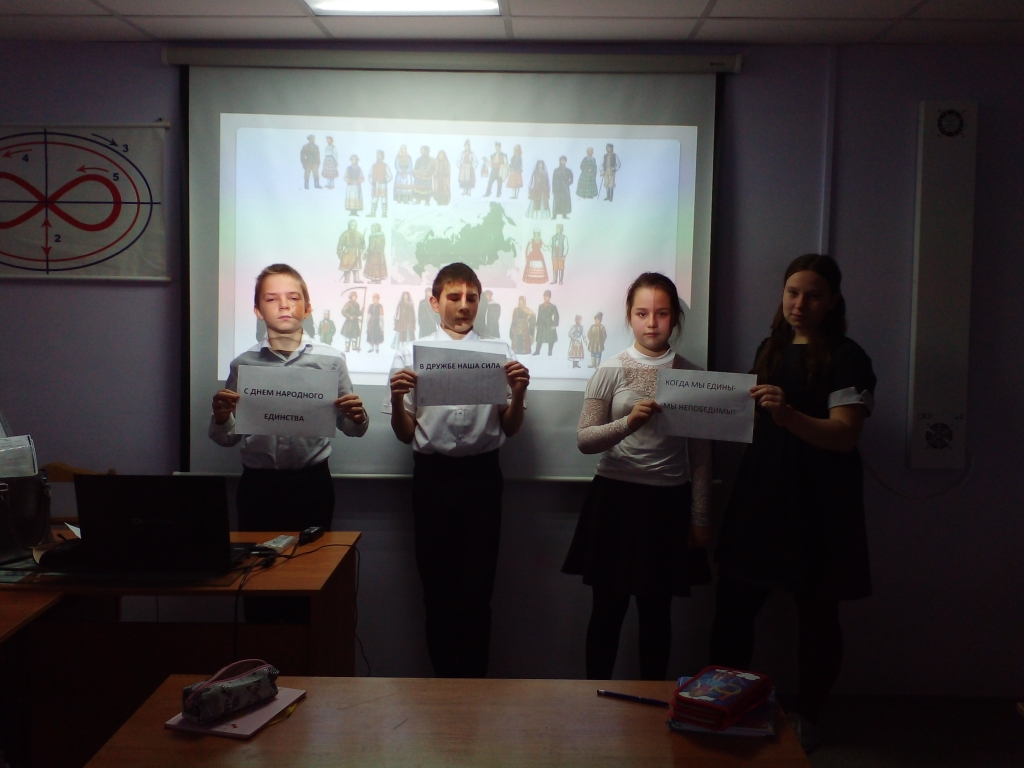7 ноября, классные руководители провели мероприятие посвещенное Дню народного единства, с целью познакомить учащихся с историей установления праздника, историческими событиями и героями, связанными с этим праздником. Были проведены беседы об истории возникновения праздника, о героях, связанных с этим праздником. Ярко , красочно были оформлены классы, использовалась презентация. В ходе беседы, дети перелистали страницы нашей истории, посвященные Дню народного единства, собирали деформирванные пословицы о родине и поясняли смысл. Безошибочно ответили на вопросы викторины и в завершении провели игры. Ученики подбирали слова на тему: Родина, Россия, Символы нашего государства, каждый ребенок высказал свое мнение. Дети поняли, что для того, чтобы добиться успеха, все они должны быть вместе, любить и беречь и защищать Родину, если она будет в опасности.