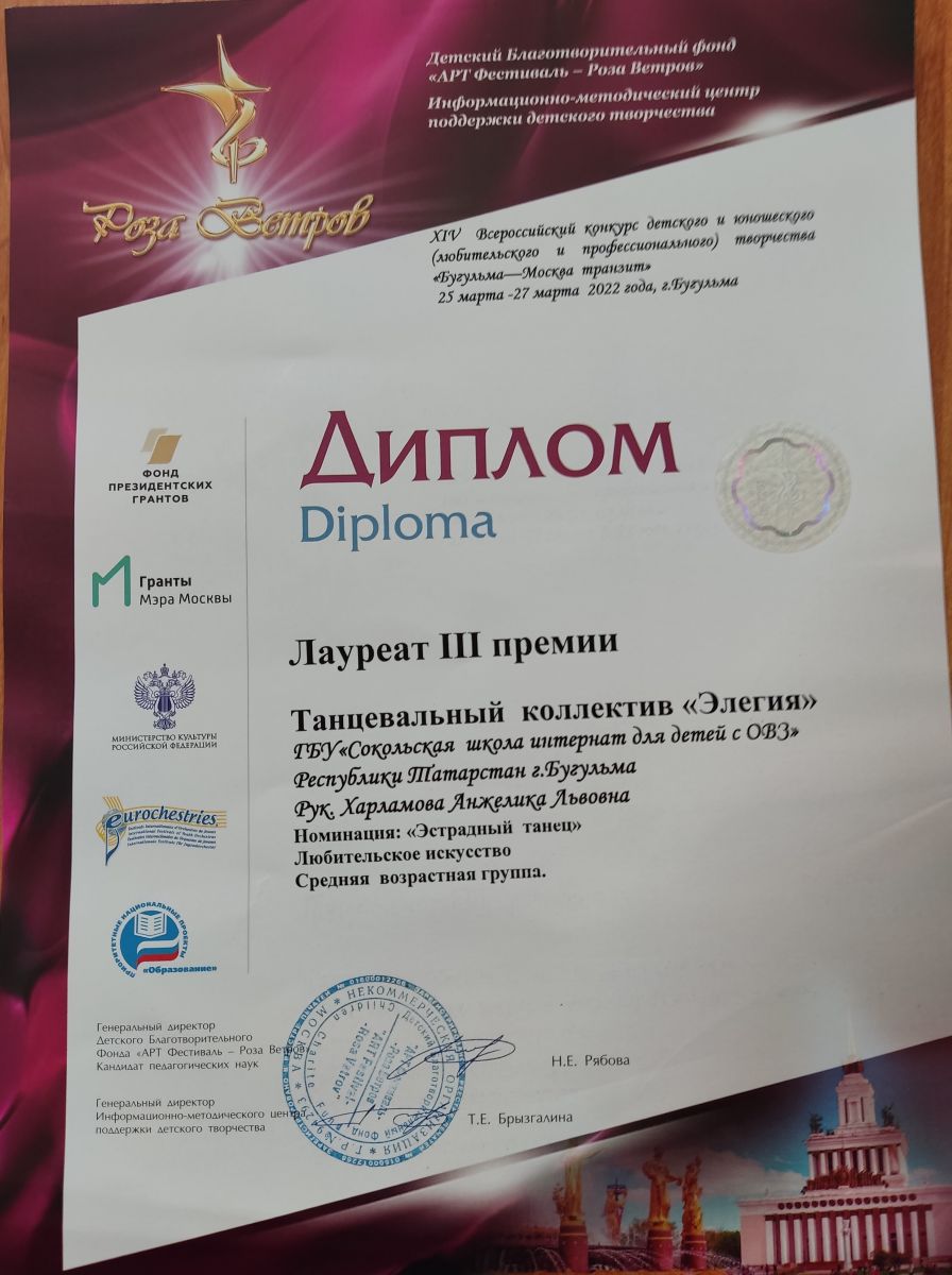 Опубликовано: 26.03.2022Учащиеся нашей школы приняли участие в конкурсе "Роза ветров" и получили Диплом Лауреат III премии в номинации: "Эстрадный танец". Педагоги школы поздравляют детей с победой на конкурсе, желают высоких результатов в следующих конкурсах и благодарят родителей за поддержку детей в конкурсе.