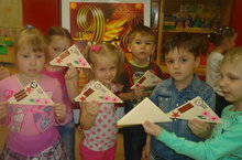 Ребята старших групп №6, № 10 АНО «Прогимназия № 14» подготовили поздравительные письма – треугольники, которые планируют подарить 9 мая 2015 года на параде Победы, ветеранам войны и труженикам тыла, поздравив их с Днем Победы. Ребята очень старательно вырезали звездочки, выводили буквы – слова поздравления, наклеивали цветы. Подготовка открыток сопровождалась рассказами о тех, кто не жалея своей жизни защищал Родину в то нелегкое время.