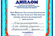 18 нче апрельдә Мәгариф идарәсе тарафыннан Бөек Җинүнең 70 еллыгына һәм Әдәбият елына багышланган “Җинү язы килә туган илгә” исемендәге нәфис сүз остасы конкурсы үткәрелде. Анда 30дан артык бала катнашты.Бу конкурста 2нче сыйныф укучысы Миргалимова Әдилә актив катнашты. Ул “Минем бабам” шигыре белән 1 нче урынга лаек булды. Бу бәйгегә әзерләгән остазына – Галиева Венера Сәлим кызына рәхмәтебезне белдерәбез һәм киләчәктә дә шундый ук югары үрләрне яулавын теләп калабыз.