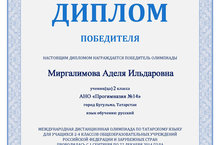 Учащиеся АНО «Прогимназии № 14» приняли активное участие в Международной олимпиаде по татарскому языку для учащихся 2-4 классов общеобразовательных учреждений РФ и зарубежных стран на дистанционно – образовательном портале «ТАТАРТЕЛЕ.ИНФО» и получили дипломы победителей: Миргалимова А., Григорьев Н., Гумерова А., Гусева А., Дроскова Д., Кислер А., Лутфуллин М., Лыкова Я., Наумова В., Павлова Я., Платонов В., Сайфуллина А., Федянина Ю., Черепанов И.