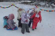 Весело проходит прогулка в младшей группе № 9 АНО «Прогимназия № 14». Играют в подвижные игры, наблюдают за явлениями природы, совершенствуются в навыках подлезания под обруч, перелезания через снежные пенечки, бросают в снежки в корзину снежным курочкам, катаются с горки.