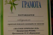 Калимуллина Р. - воспитанница подготовительной к школе группы АНО ОО «Прогимназия №14» одержала победу в городской олимпиаде для дошкольников "Знатоки природы - 2018", которая проходила на базе МБДОУ № 37 «Родничок"». Поздравляем и желаем дальнейших побед!!!!!!