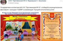 Поздравляем коллектив АНО ОО "Прогимназия №14" с победой в муниципальном фестивале - конкурсе "САЙЯР" в номинации "Лучший исполнитель роли".