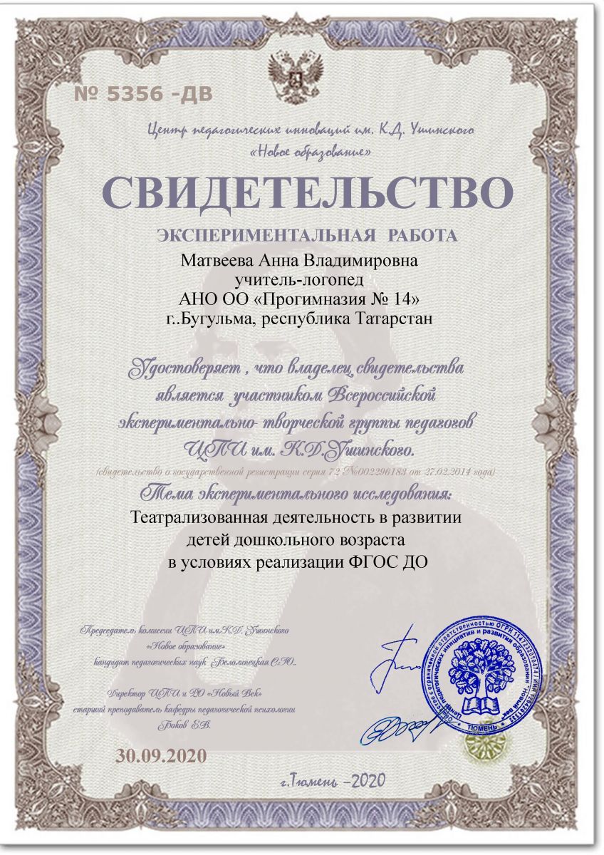 Свидетельство эксперитентальной работы учителя - логопеда Матвеевой А В