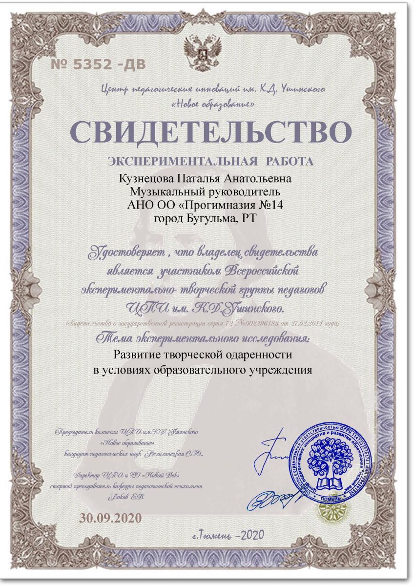 Свидетельство экспериментальной работы музыкального руководителя Кузнецовой Н. А.