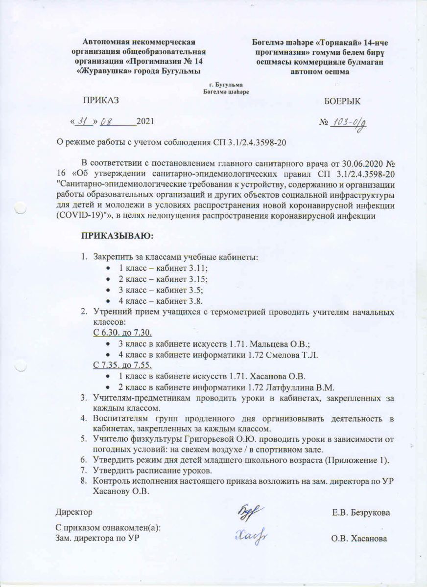 Приказ о режиме работы с учетом соблюдения СП 3.1/2.4.3598-20