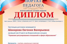 Учитель начальных классов Шакирова Евгения Валерьевна участвовала во Всероссийском конкурсе "Правовое регулирование отношений в сфере образования" и заняла III место. Поздравляем!!!
