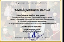 Благодарственные письма были вручены Шигабутдиновой А.М., Семьяновой О.И.,Старостину А.А., Павловой О.Н. от организационного комитета Всероссийского историческогго центра "Летописец".