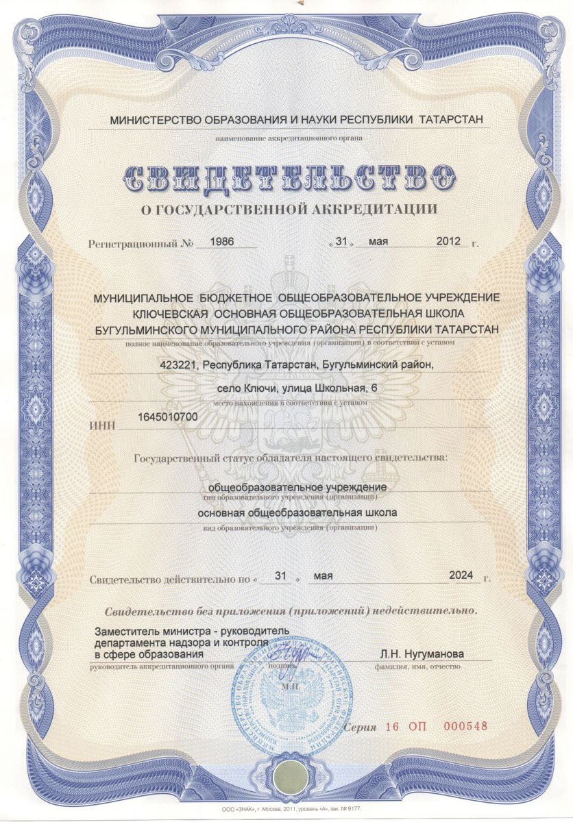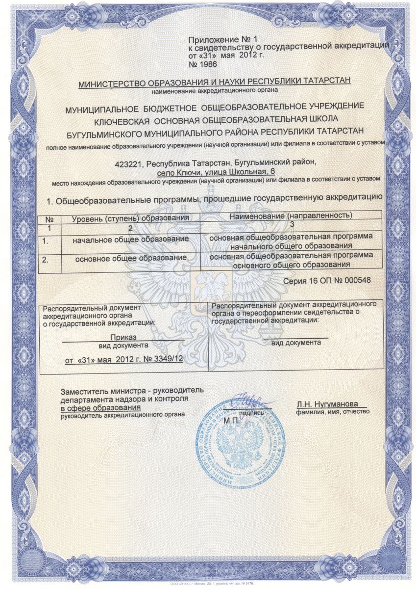 Свидетельство о государственной аккредитации " 1986 от "31" мая 2012 года от 22 марта 2017 г. Срок действия свидетельства до 28 декабря 2024 г. Приложение № 1 к свидетельству о государственной аккредитации от "31" мая 2012 года № 1986
