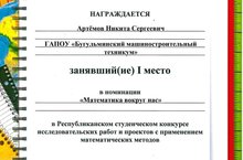 Студент 210 группы Артемов Никита занял 1 место в номинации "Математика вокруг нас" в рамках Республиканского студенческого конкурса исследовательских работ и проектов с применением математических методов